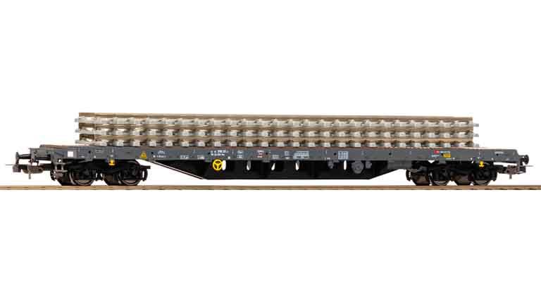 Вагон-платформа в схеме окраски строительного поезда приписки SBB эпохи VI. Вагон загружен рельсами с бетонными шпалами.
