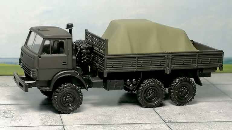 Коллекционная модель «Автомобиль КабАЗ бортовой с грузом под брезентом» из пластика рекомендуется для диорам в масштабе 1/87 и железнодорожных макетов типоразмера Н0 (1:87). Окраска модели не требуется.