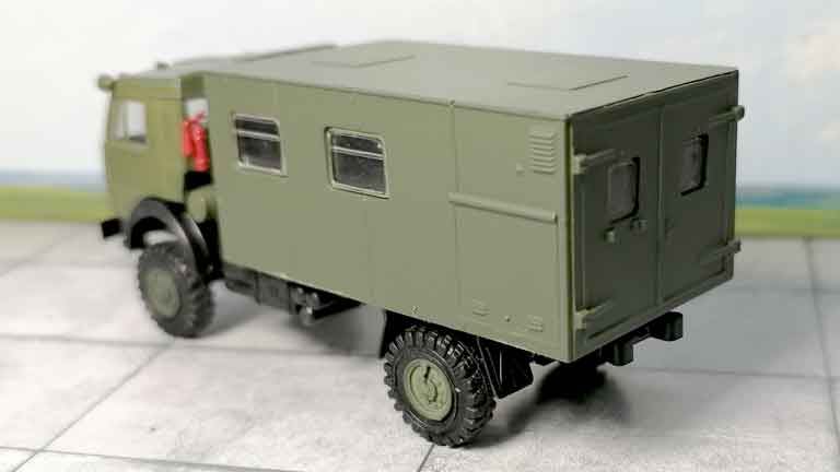 Коллекционная модель «Автомобиль грузовой КабАЗ (металлическая будка полевой ремонтной мастерской, спальник, 2 моста, полный привод 4х4)» из пластика рекомендуется для диорам в масштабе 1/87 и железнодорожных макетов типоразмера Н0 (1:87). Окраска модели не требуется.